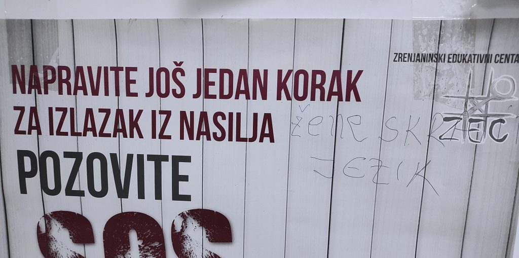 Da se situacija nije popravila i da društvo u kome živimo i dalje nema svest o ovom problemu, možemo videti i na fotografiji ispod, nastaloj juče u zrenjaninskoj ambulanti. Na posteru koji osnažuje žrtve da prijave nasilje, neko je hemijskom olovkom dopisao: Žene, skratite jezik.
