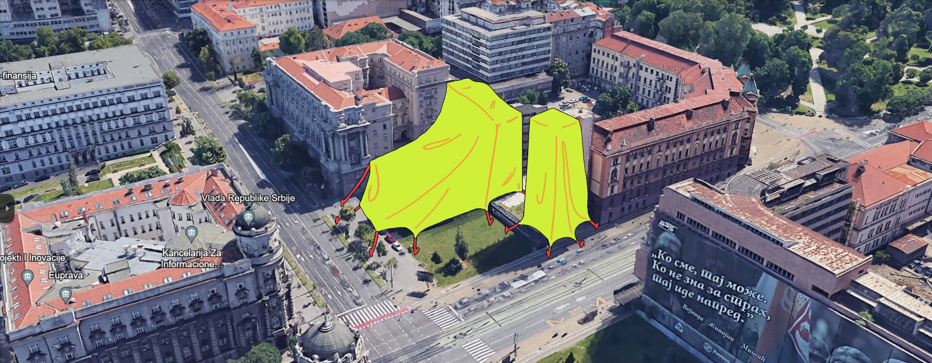 Ipak, najviše pažnje javnosti privukla je informacija koju su preneli brojni mediji – da će se preko puta zgrade Vlade, na mestu Generalštaba u ulici Kneza Miloša, graditi luksuzni hotelski kompleks. Već dve i po decenije se, sporadično, vode diskusije šta bi trebalo učiniti sa ovom zgradom koja je oštećena u bombardovanju Srbije 1999. godine.