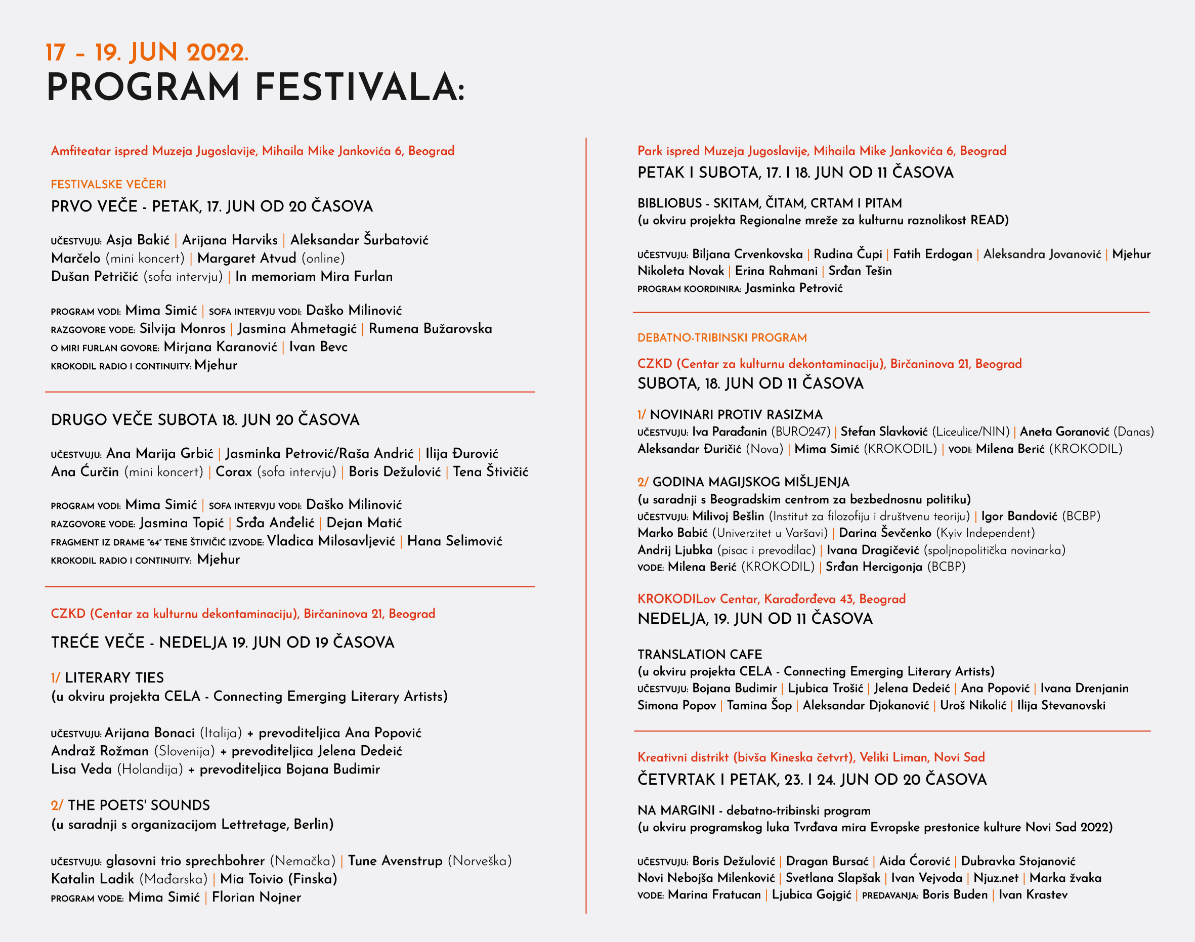 Ispred Muzeja Jugoslavije u petak 17. juna i u subotu 18. juna od 20 sati u okviru prve dve festivalske večeri biće predstavljena vrhunska selekcija domaćih, regionalnih i stranih spisateljica i pisaca, ali i muzičarki/muzičara, glumica/glumaca i drugih. S ponosom najavljujemo učešće od jedne od najvećih živih svetskih autorki Margaret Atvud, koja će nam se pridružiti online na polučasovnom razgovoru sa spisateljicom Rumenom Bužarovskom i Mimom Simić, ali i čitanjem online iz svog doma u Kanadi. Najavljujemo s ponosom i uživo učešće argentinskog književnog čuda Arijane Harviks, čiji je ubojiti roman Crkni ljubavi u mahu osvojio naše čitateljke i čitaoce.