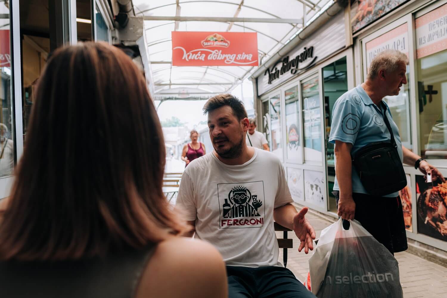 Primećujemo da na pijaci ima dosta pečenjara, što i nije neobično. Jedna tradicionalna pečenjara je baš preko puta Pretopa, te nas zanima da li se oseća konkurencija. Ekipa za stolom preko puta se smeje, dok Nikola objašnjava da zapravo nema konkurencije jer je način pripreme drugačiji.
