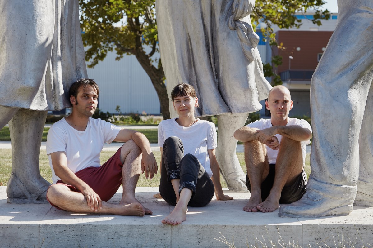 Naslovna fotografija: Autorski tim predstave Raspevana mladost ispred istoimene skulpture (Foto – Sári Ember)