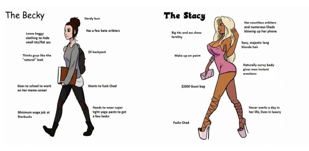 Zgodna belkinja, duge plave kose, krupnih očiju i punijih usta, izraženih oblina, bila bi takozvana Stejsi. To je ona najpoželjnija devojka u svakoj srednjoj školi, koja je u vezi sa najzgodnijim muškarcem, obično atletom, dobrog društvenog statusa i neodoljivog šarma – Čadom.