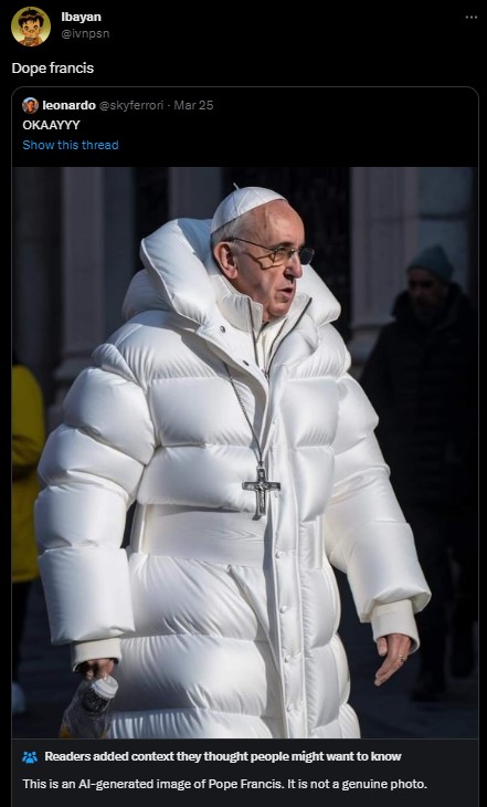 U digitalnom prostoru svakog dana nailazimo na fotografije, TikTok videe i pompezne vesti za koje se čini da bi im jedino pravo mesto bila rubrika – verovali ili ne. Društvene mreže, naravno, glavni su medij preko koga ove ponekad zanimljive, a vrlo često i apsurdne informacije dopiru do svih nas. Prema mnogobrojnim istraživanjima, posebno na Tviteru, ovakve informacije šire se brže nego one koje su istinite i proverene. Jedna upravo takva, smešna i pomalo čudna fotografija nedavno se proširila virtuelnim svetom, a na njoj je bio, ni više, ni manje, nego Papa Franjo u oversized modernoj jakni, za koju se spekulisalo da podseća na komad modnog brenda Balenciaga. Visoki poglavar rimokatoličke crkve prošetao se u takozvanoj „jorgan“ pufnastoj beloj jakni preko koje je visio simbol hrišćanstva – veliki krst. Uprkos velikom nivou popularnosti i deljenja, nakon par dana od prvog objavljivanja ove fotografije, ispostavilo se da je ona sve, samo ne – prava.