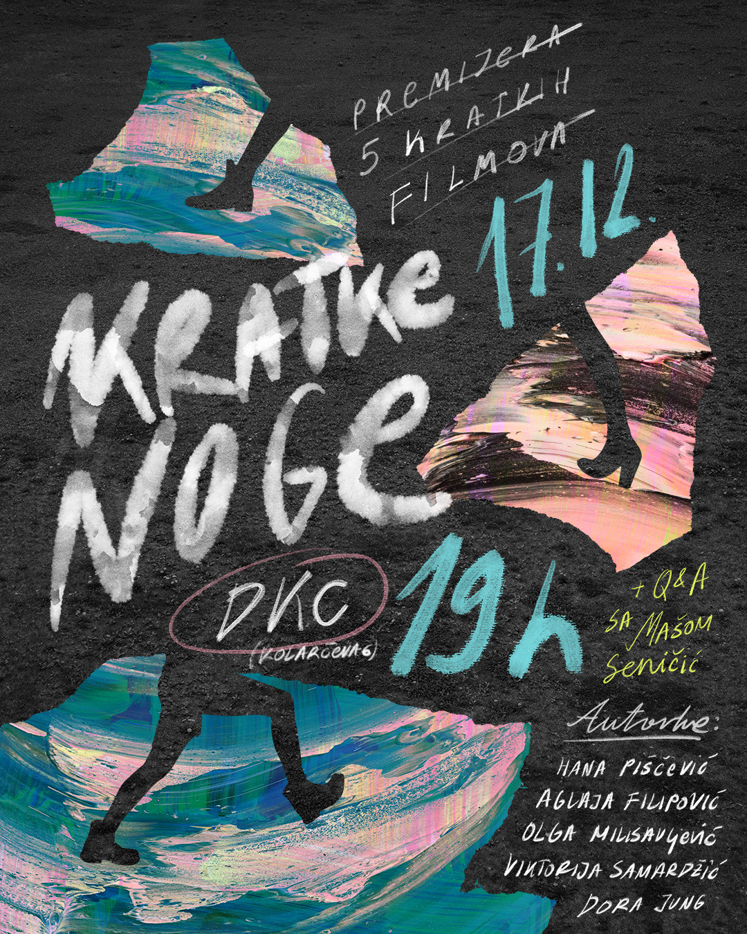 U petak, 17. decembra, u Dvorani Kulturnog centra Beograda (DKC) biće priređena filmski program naslovljen „Kratke noge“, odnosno, projekcija pet kratkih igranih filmova mladih autora. Program će početi u 19 časova, a ulaz je besplatan.