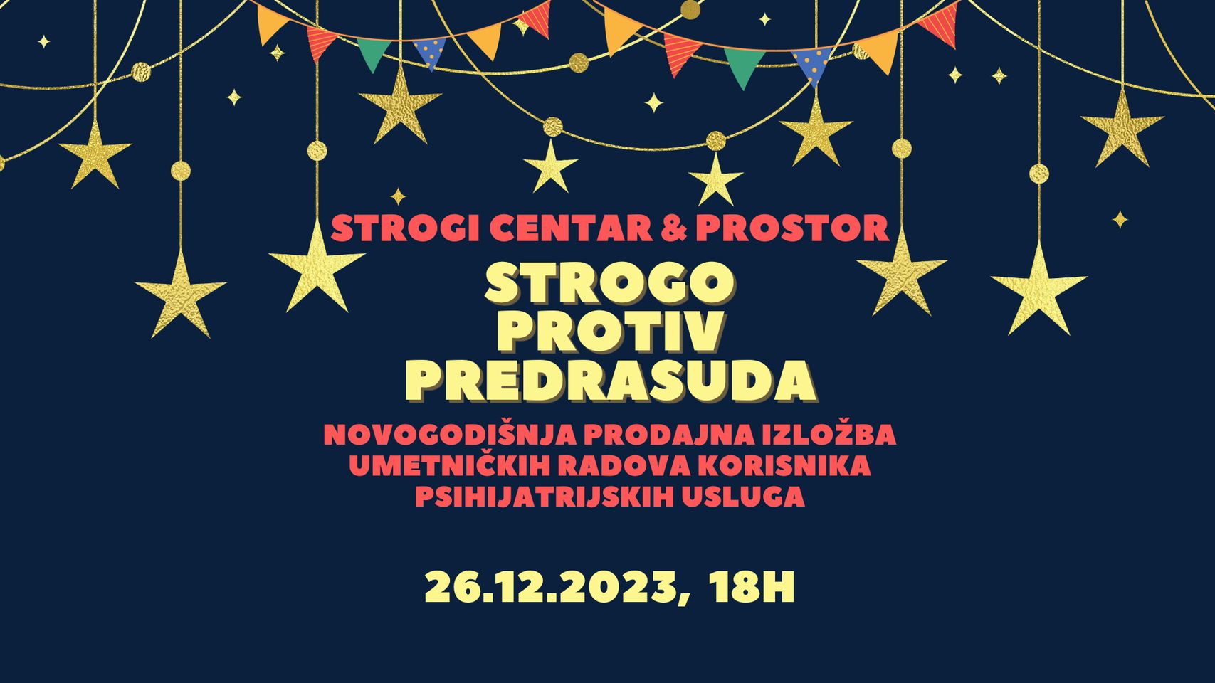 Da li ste znali da se sudeći po nedavnim istraživanjima svaka treća osoba u Srbiji može smatrati psihološki ugroženom a svaka šesta zaslužuje pažnju stručnjaka? U isto vreme, ljudi koji se leče na psihijatriji predstavljaju jednu od najugroženijih kategorija stanovništva naše zemlje. Dođite u Strogi da se upoznamo, da vidite šta radimo u Prostoru i kupovinom umetničkih radova omogućite korisnicima da zadovoljni uđu u Novu godinu! Strogo protiv predrasuda!