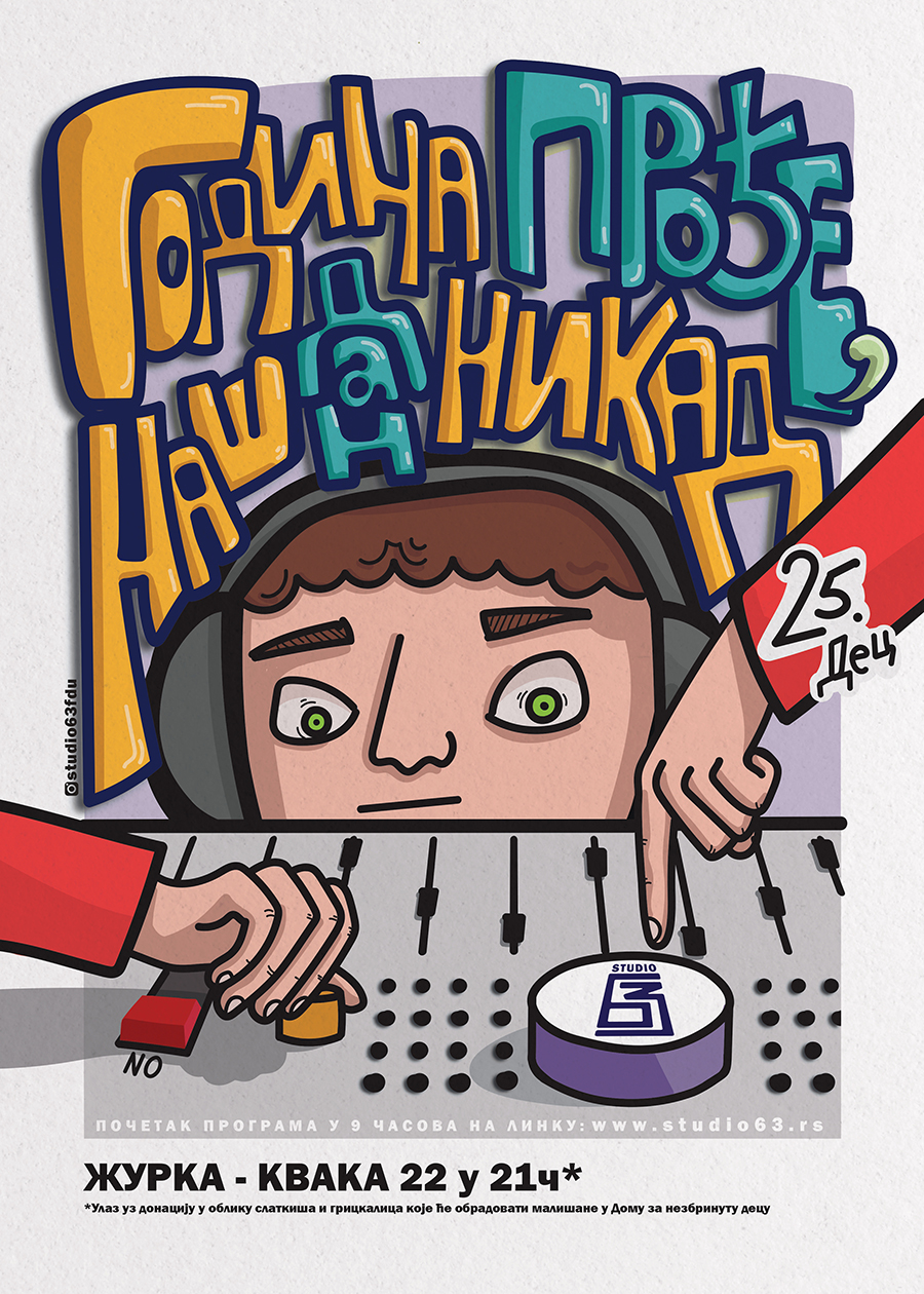 Katedra za snimanje i dizajn zvuka na Fakultetu Dramskih umetnosti osnovala je studentski radio “Studio 63”. Začet kao radijski eksperiment, danas je prerastao u projekat u usponu koji će se uz ozbiljan pristup, ambiciozno generacijama prenositi i oblikovati. Odvija se krajem godine i obuhvata jednodnevnu realizaciju. Studio 63 pruža prostor studentskoj slobodi da svoju maštu pretoče u realnost. Omogućava da se glas mladih idndividualaca čuje, kroz autorske emisije edukativnog, informativnog, humanitarnog i zabavnog karaktera. Poslednja emisija će se emitovati iz Kvake 22 sa početkom u 20h nakon čega će se nastaviti žurka zatvaranja. Uslov za ulaz je donacija u vidu paketića koji će biti prosledjeni Domu za nezbrinutu decu i ulepšati mališanima praznike.