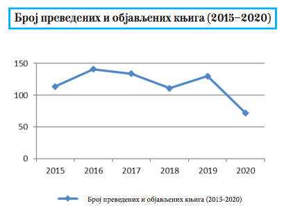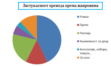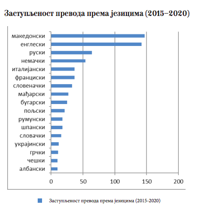 Roman je žanr koji najviše privlači pažnju izdavača, posle čega sledi poezija i književnost za decu. Dela srpskih autora najviše su prevođena na makedonski, engleski, ruski, nemački i italijanski jezik u periodu od 2015. do 2020. godine. Autori istraživanja podsećaju na slabu recepciju prevoda književnih dela na engleski jezik iz tzv. malih jezika, zbog stotina hiljada knjiga koje se godišnje objave na ovom internacionalnom jeziku u UK i SAD. Lista naslova srpskih autora koji su u petogodišnjem periodu obuhvaćeni upućuju na ponovno najčešće objavljivanje klasika – Andrića, Kiša, Pavića, ali i na savremene autore poput Albaharija, Živkovića, Basare, Velikića i drugih.