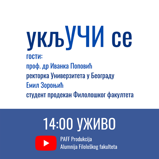 U ponedeljak, 6. jula od 14 časova na kanalu PAFF produkcije alumnija Filološkog fakulteta, emitvana je uživo još jedna epizoda emisije „Uključi se“. Sagovornici su bili rektorka Univerziteta u Beogradu Ivanka Popopović i Emil Zoronjić, student prodekan Filološkog fakulteta Univerziteta u Beogradu.