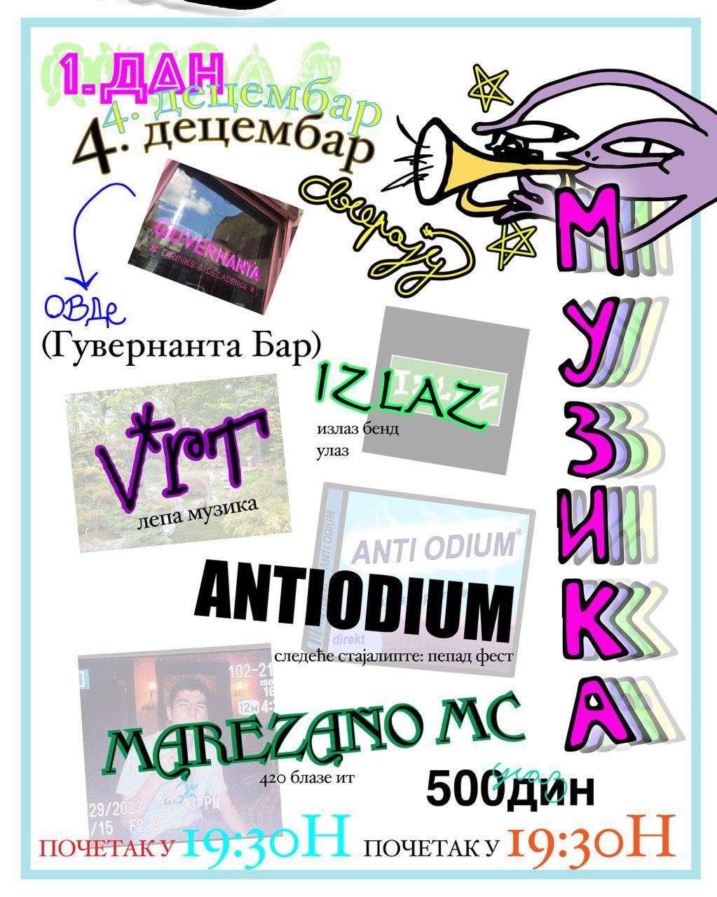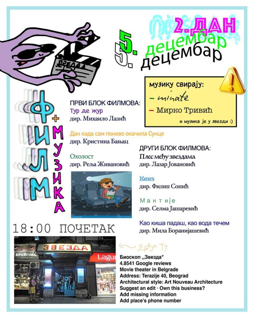U četvrtak, 4. decembra od 19.30 u Guvernanti (Balkanska 4) na programu su bendnovi (Antiodium, Vrt, Izlaz i Marezano MC), a sutradan u Zvezdi (Terazije 40) nastupaće muzičari Mirko Trivić i Minate, pa će se gledati filmovi mladih filmskih ekipa (filmovi: Tur de žur, Dan kada sam ponovo okačila sunce, Oholost, Ples među zvezdama, Kenz, Mantije i Kao kiša padaš, kao voda tečem). Program počinje u 18 sati.