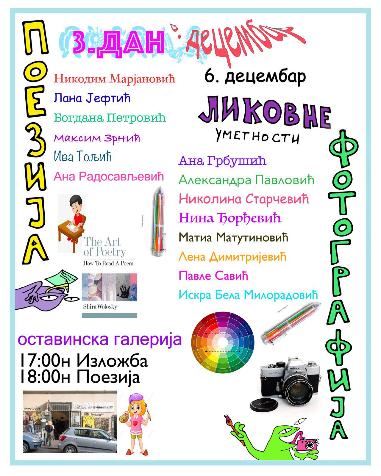 Poslednjeg dana, u Ostavinskoj galeriji (Kraljevića Marka 8) čeka vas otvaranje izložbe likovnih i fotografskih radova s početkom u 17 sati, posle toga – čitanje poezije.