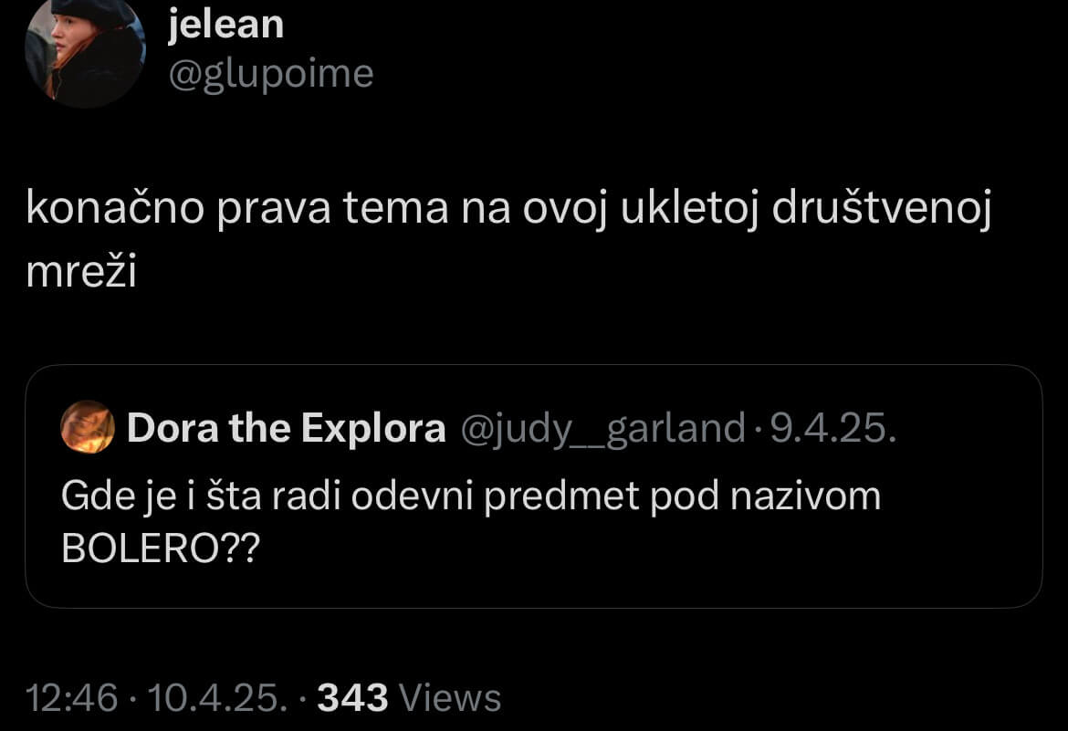 Hodaš, a odjednom… Reel. Rat. funny meme. Dobar dan, je l’ imate Rhode? S poštovanjem. Loafers. kredit. story. story. Trenerka, serum. Rejv. Protest. Matcha latte. Kriza. Lača mati. Pleteni kardigani su novi bolero. Nebo je boje carinskih taksi, farmerke su niskog struka navodno već tri godine – iako se pravimo da se to ne dešava, recepti su viralni, a sve miriše na brat. Studenti ili ća…o svima, trenerka i serum. Kosovo. Izvini što pitam, ali koliko plaćaš stan? Reel. Kripto. brat. Brend. hey guys! samo bez bolera, molimo vas.