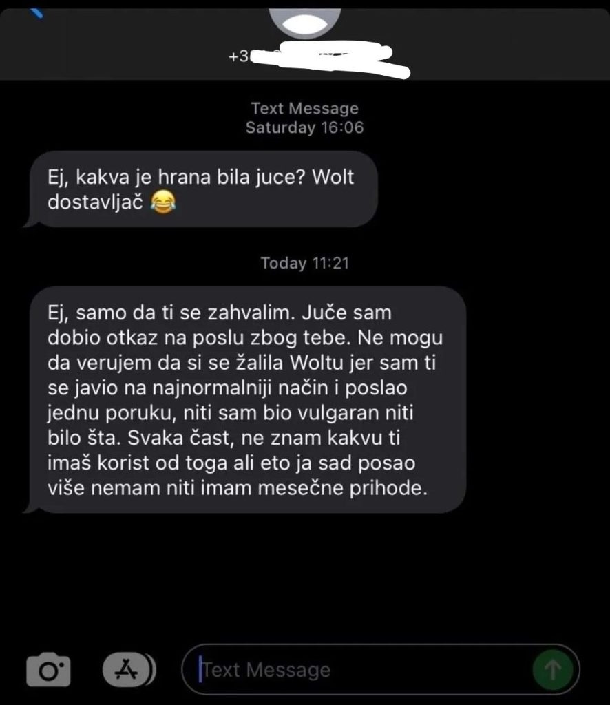 Juče se društvenim mrežama proširio skrinšot na kome se jasno vide poruke koje je dostavljač Wolta slao jednoj od korisnica, nakon što je joj je dostavio hranu. Naime, dostavljač je nakon obavljene usluge korisnici poslao poruku sadržaja Ej, kakva je hrana bila juče? Wolt dostavljač, nakon čega je korisnica ovu poruku prijavila Woltu.