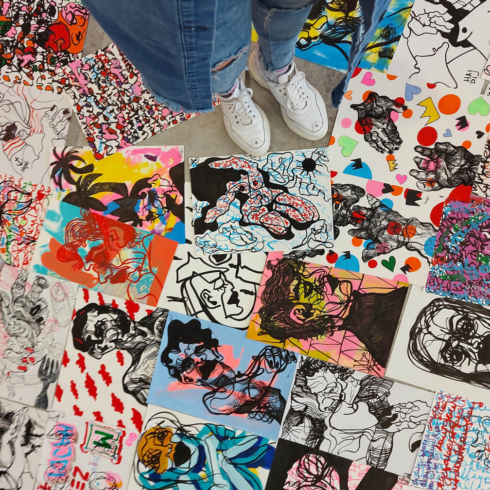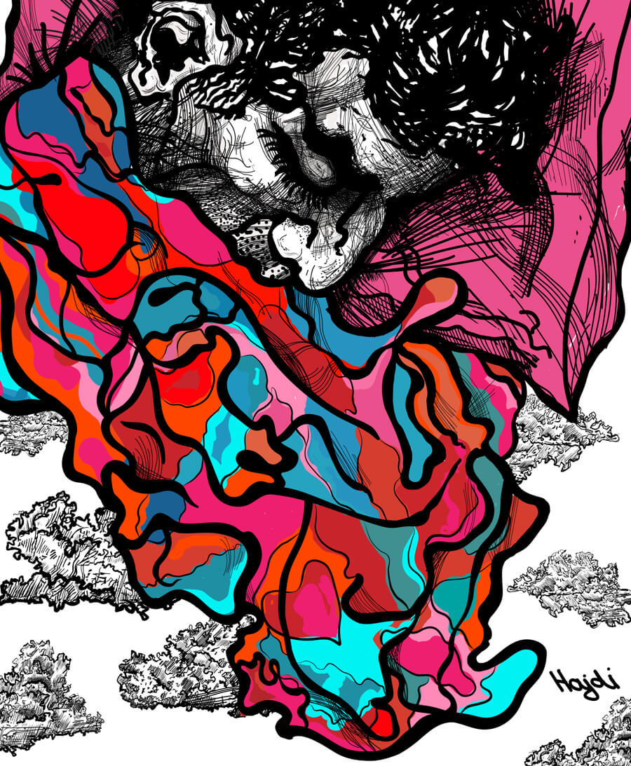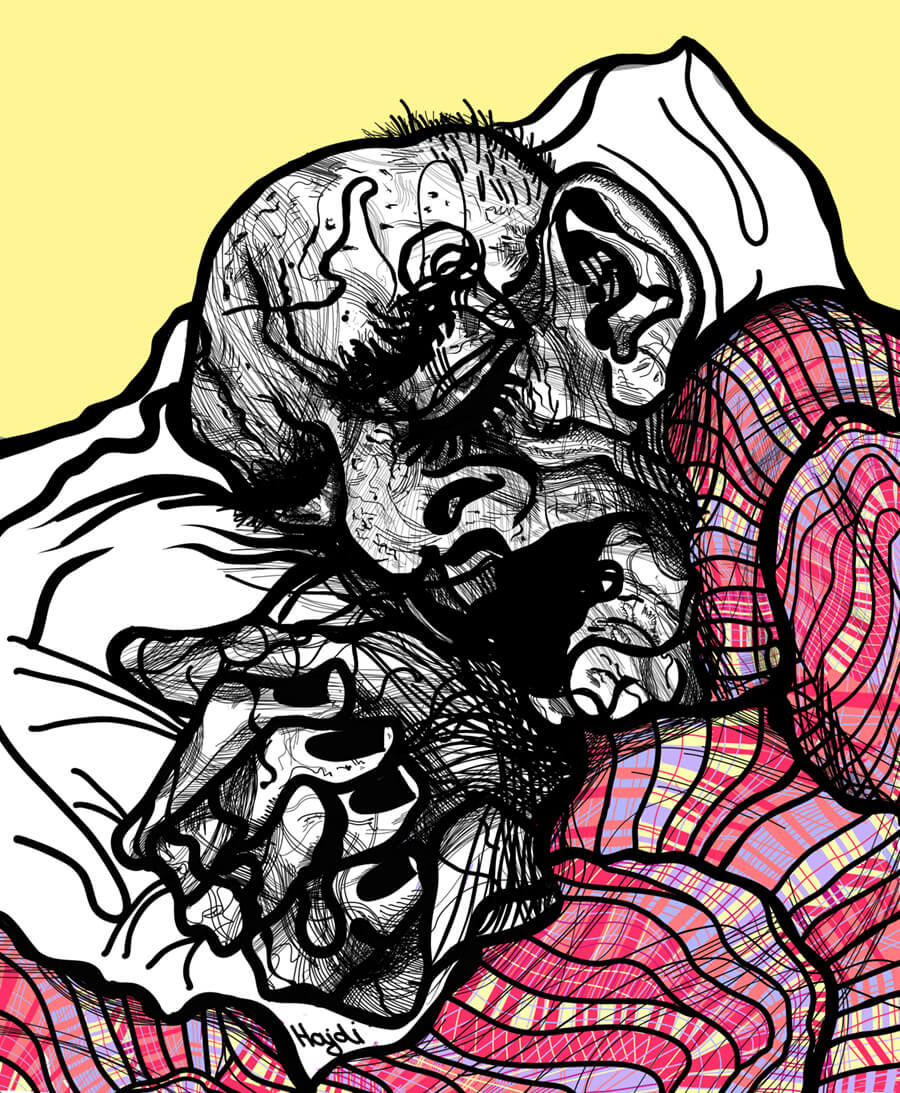 Hajdana Kostić: Prijavila sam se na konkurs 2020. godine jer mi se sviđa koncept Ulične galerije – napolju je i nije uslovljeno radnim vremenom i nekim drugim formatima. Kada sam rešila da se prijavim, tek sam tada odlučila da proberem šta mogu da predstavim kao seriju radova, jer je dosta radova koje sam radila za izazov 365 bilo spontano, nabacano, različitih stilova. Tražeći nešto reprezentativno, ispostavilo se da imam dosta crteža ljudi koji spavaju. Često sam te ljude crtala jer sam ostavljala izazov do 12 sati uveče i onda krenem da crtam u poslednjem trenutku da bih objavila tog dana. Često mi se dešavalo da se ljudi uvrede kada vide kako izgledaju na mojim crtežima i komentarišu da to nisu oni (smeh). Jedno vreme sam dosta crtala oca mog momka i baš su se prodavali njegovi portreti. Onda je rekao kako neće više da spava pred nama i da mora da počne da uzima procenat od prodaje (smeh).