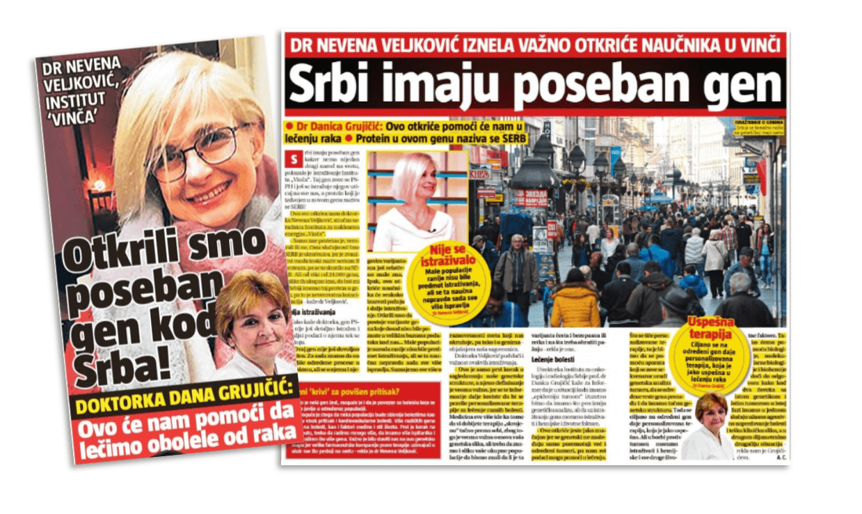 Srbi imaju poseban gen naslov je teksta koji se našao u štampanom izdanju Informera. Ovo je još jedna u nizu lažnih vesti ovog časopisa koji se prema listi Fake News tragača nalazi na drugom mestu Top 15 izvora manipulacije. Naime, u tekstu se referiše na gostovanje naučne savetnice Instituta „Vinča“ dr Nevene Veljković u jutarnjem programu televizije Prva. U tekstu se pominje i izjava dr Dane Grujčić koja je izjavila da će ovaj gen pomoći da lečimo obolele od raka. Ipak mnoge stvari iz Nevenine izjave izvučene su iz konteksta, dovoljno za dalji razvoj lažne vesti, kakva je i ova. Na Jutjubu postoji i snimak iz emisije, te je bilo moguće uporediti kontekst razgovora na televiziji i onaj koji su preneli u časopisu. U ovakvim situacijama bitno je istražiti što više izvora i obratiti pažnju kako je vest plasirana, da li se izjave poklapaju ili se manipulisalo podacima.